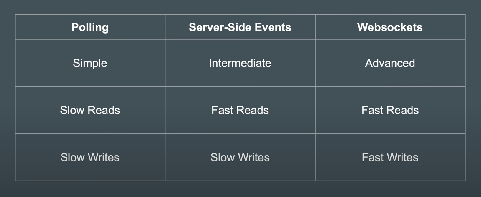 methods for clients to listen backend why traditionally, a backend can only listen to a frontend realtime elements cannot be updated methods server sent events (SSE) Websockets Polling pubsub??? choice 1 references references Don’t Use Websockets by Code with Ryan ↩